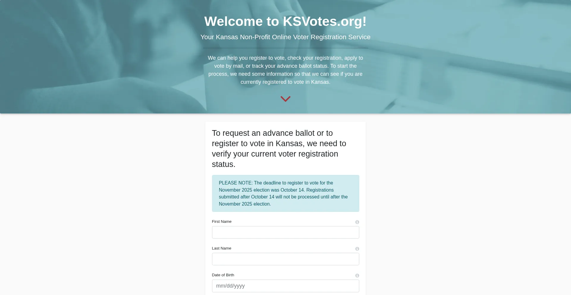 该网站实现数据收集表单,请求个人信息,包括姓名、电子邮件地址、电话号码或其他敏感详细信息。用户应验证 ksvotes.org 的合法性并在提交个人数据前查看隐私政策。