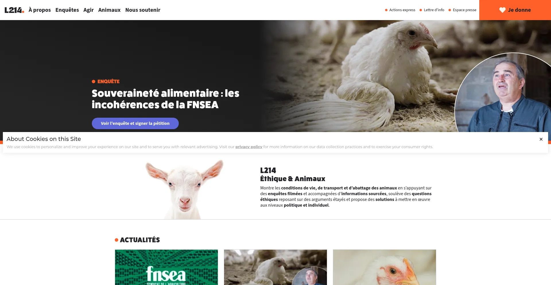 L214 Éthique & Animaux montre les conditions de vie, de transport et d’abattage des animaux en s’appuyant sur des enquêtes filmées et accompagnées d’informations sourc...