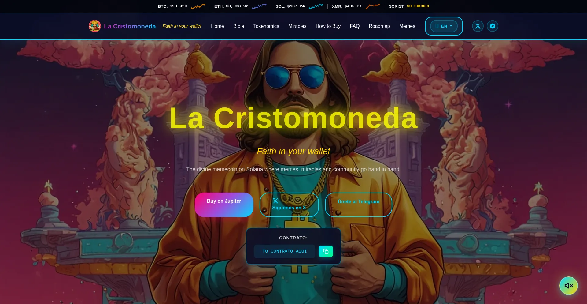 La Cristomoneda ($CRIST): la memecoin divina en Solana donde los memes, los milagros y la comunidad van de la mano. 3% destinado al Fondo de los Milagros para causas benéficas.