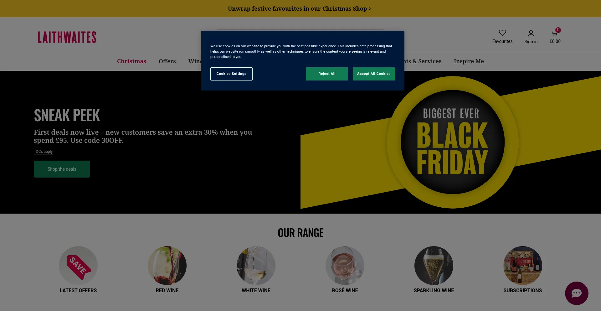该网站实现符合GDPR或CCPA等隐私法规的cookie同意机制。这表明 laithwaites.co.uk 遵守数据保护标准并为用户提供对个人数据收集实践的控制。