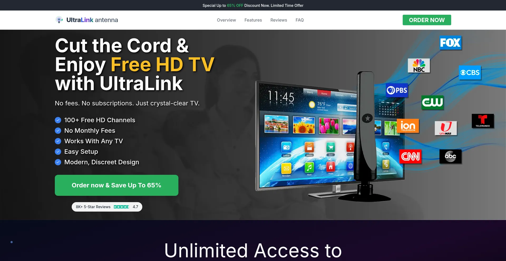 Get crystal clear HD TV channels for FREE with UltraLink Antenna. No monthly fees, no subscriptions. Easy 3-step setup. 30-day money-back guarantee. Order now!