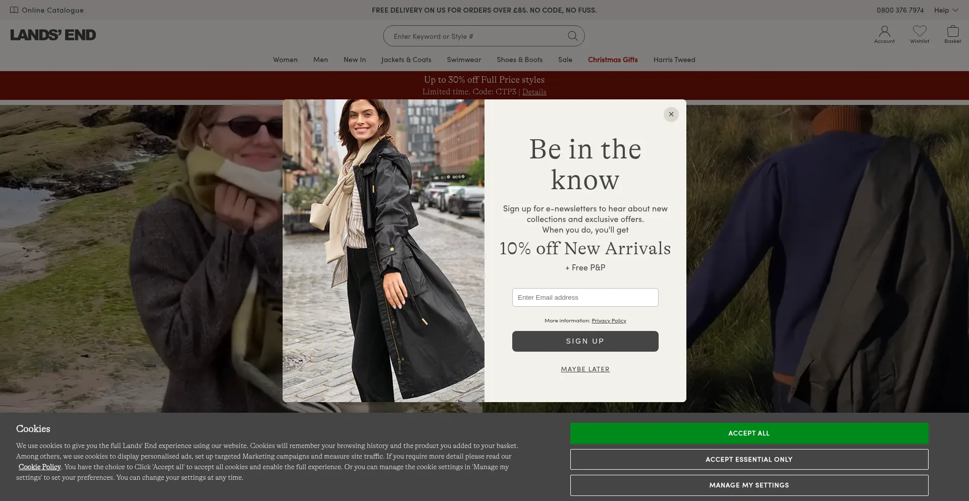 该网站实现数据收集表单,请求个人信息,包括姓名、电子邮件地址、电话号码或其他敏感详细信息。用户应验证 landsend.co.uk 的合法性并在提交个人数据前查看隐私政策。
