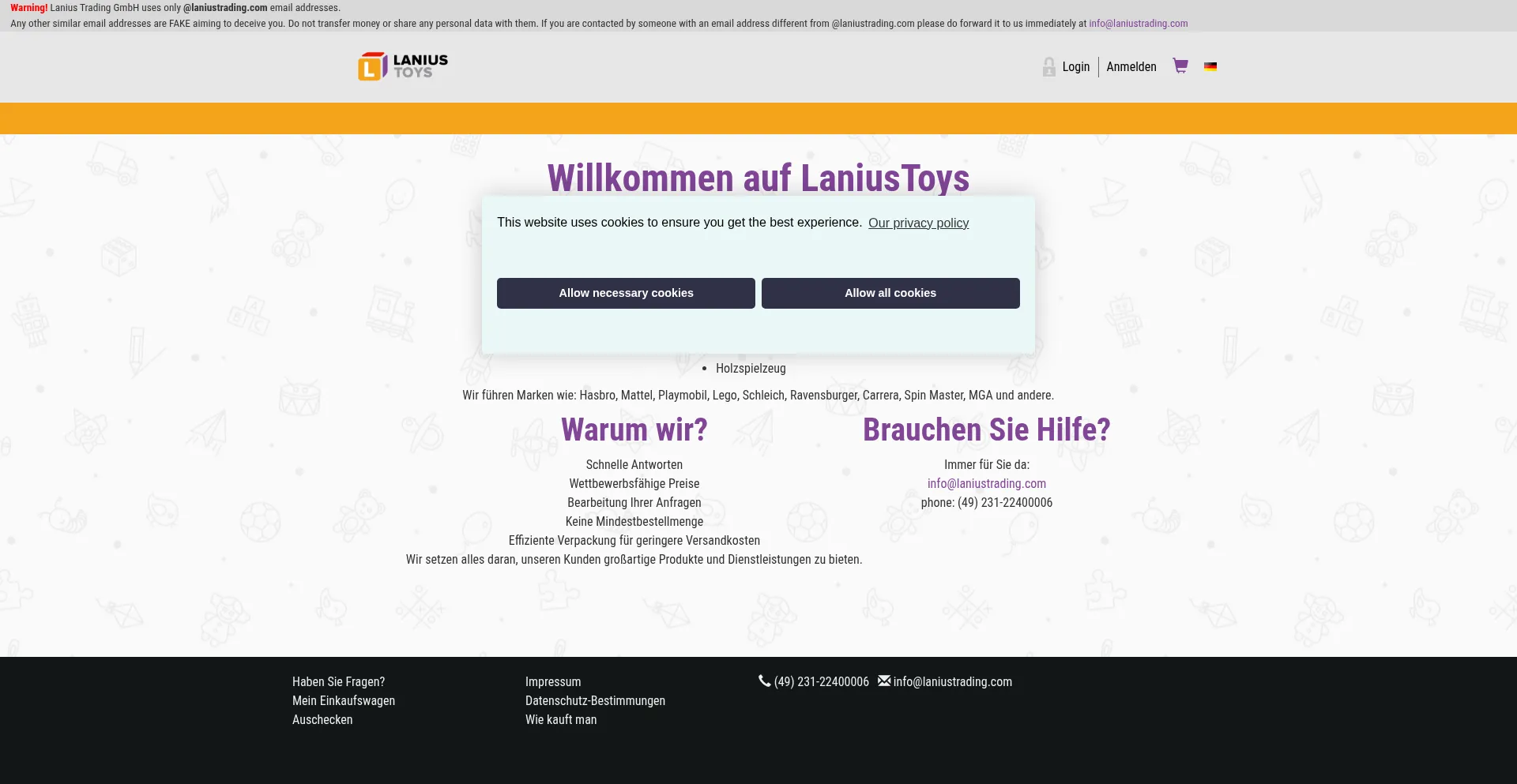 该网站实现符合GDPR或CCPA等隐私法规的cookie同意机制。这表明 laniustoys.com 遵守数据保护标准并为用户提供对个人数据收集实践的控制。
