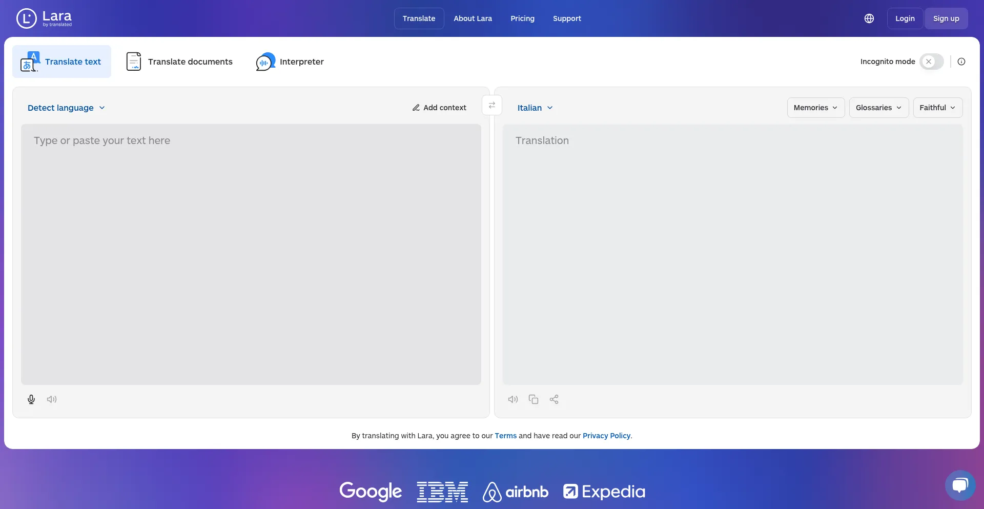 Translate texts, conversations and full document files instantly with Lara, the World's most reliable AI translator