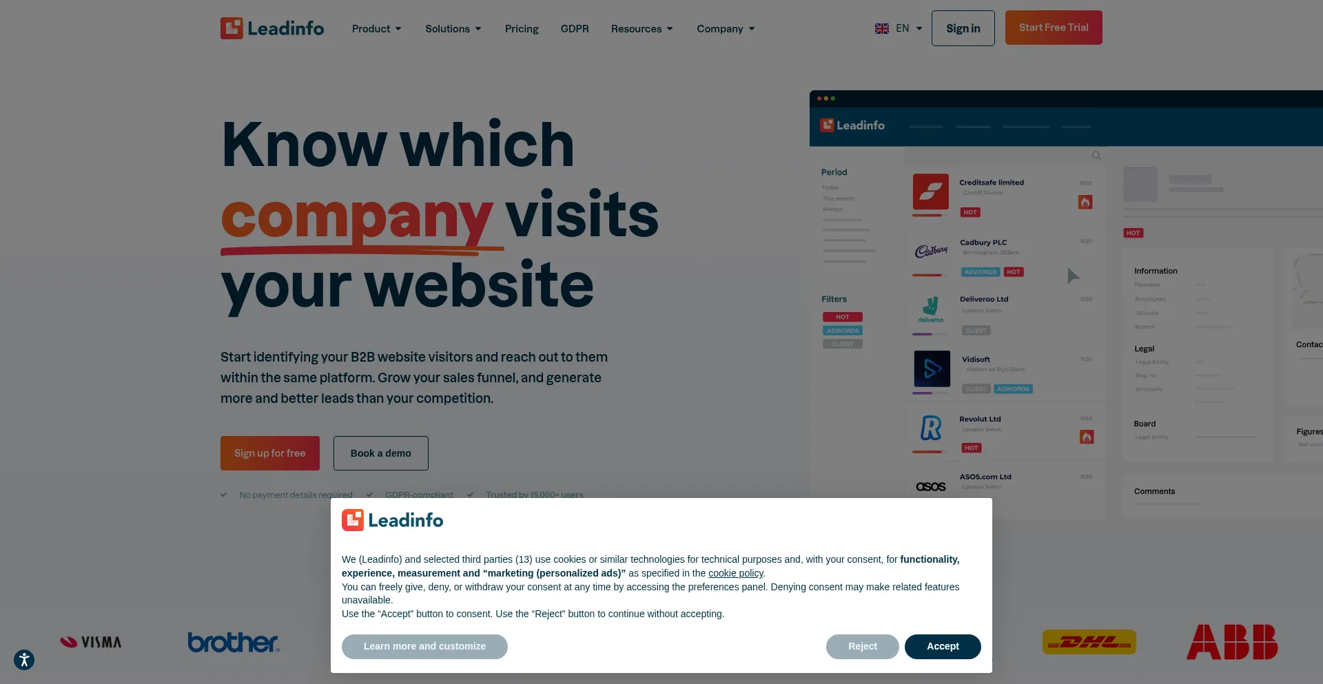 Grow your sales funnel and generate better leads. Start identifying B2B website visitors and reach out to them within Leadinfo's all-in-one platform.