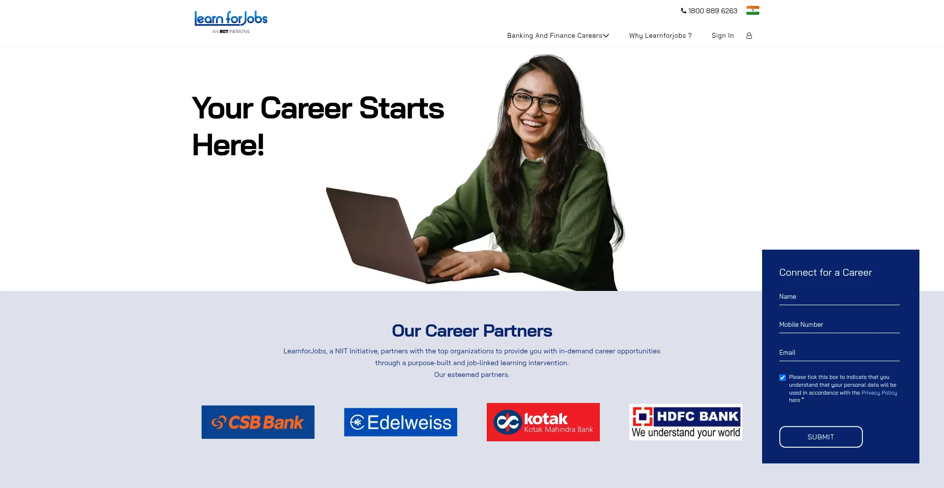 该网站实现数据收集表单,请求个人信息,包括姓名、电子邮件地址、电话号码或其他敏感详细信息。用户应验证 learnforjobs.niit.com 的合法性并在提交个人数据前查看隐私政策。