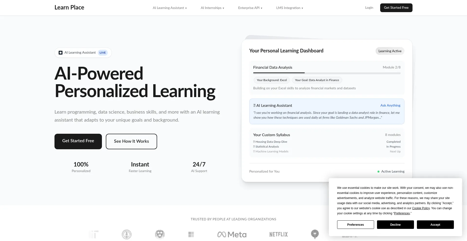 该网站实现符合GDPR或CCPA等隐私法规的cookie同意机制。这表明 learnplace.ai 遵守数据保护标准并为用户提供对个人数据收集实践的控制。