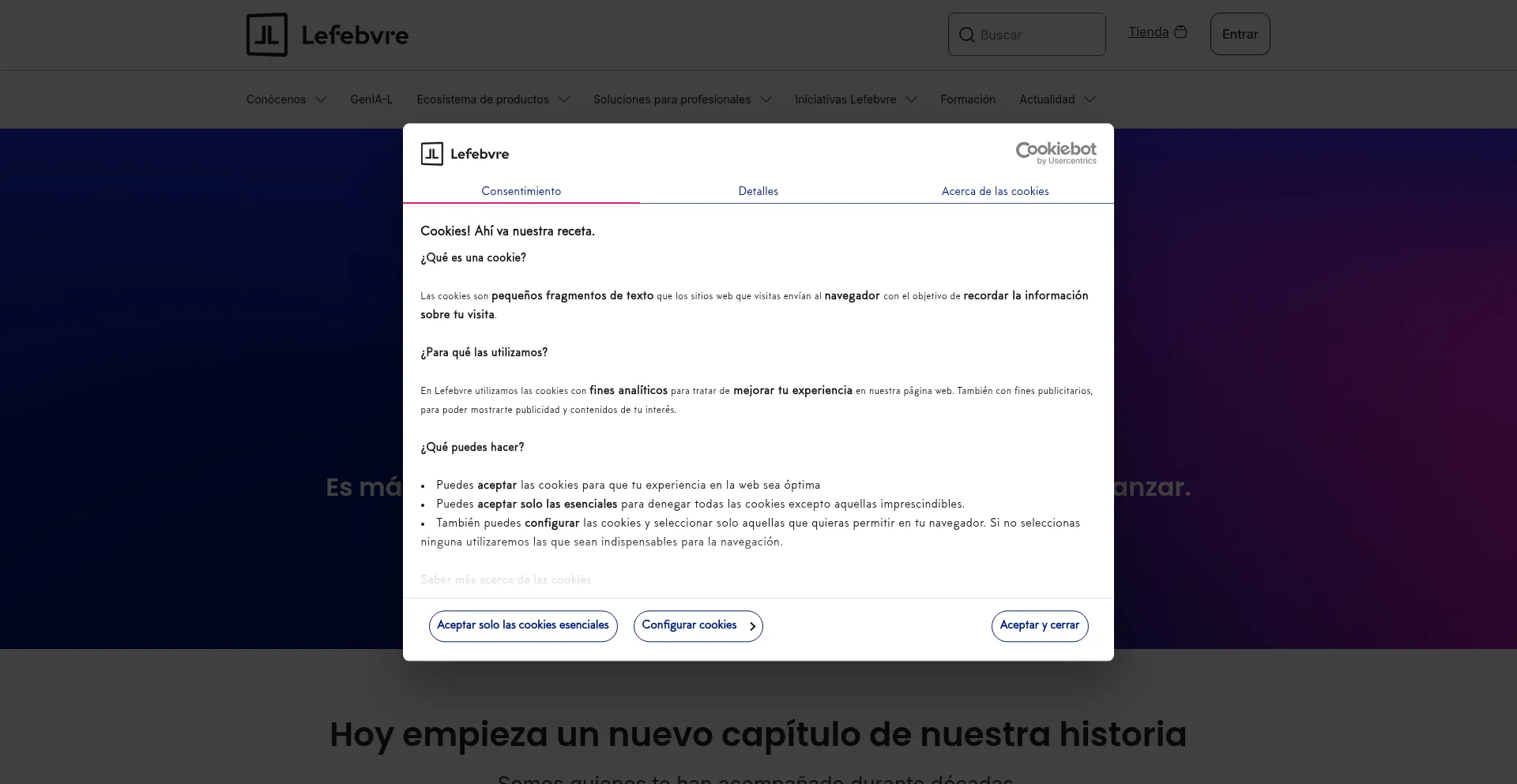 该网站实现符合GDPR或CCPA等隐私法规的cookie同意机制。这表明 lefebvre.es 遵守数据保护标准并为用户提供对个人数据收集实践的控制。