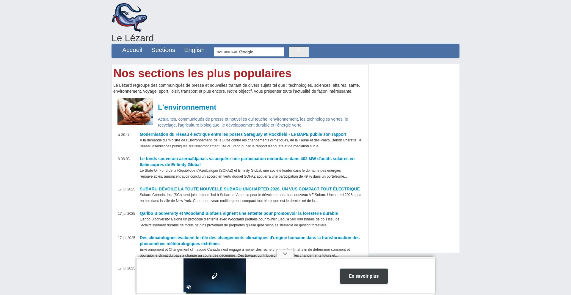 Le Lézard regroupe des nouvelles traitant des technologies, sciences, affaires, santé, environnement, voyage, sport, loisir, du transport et plus encore.