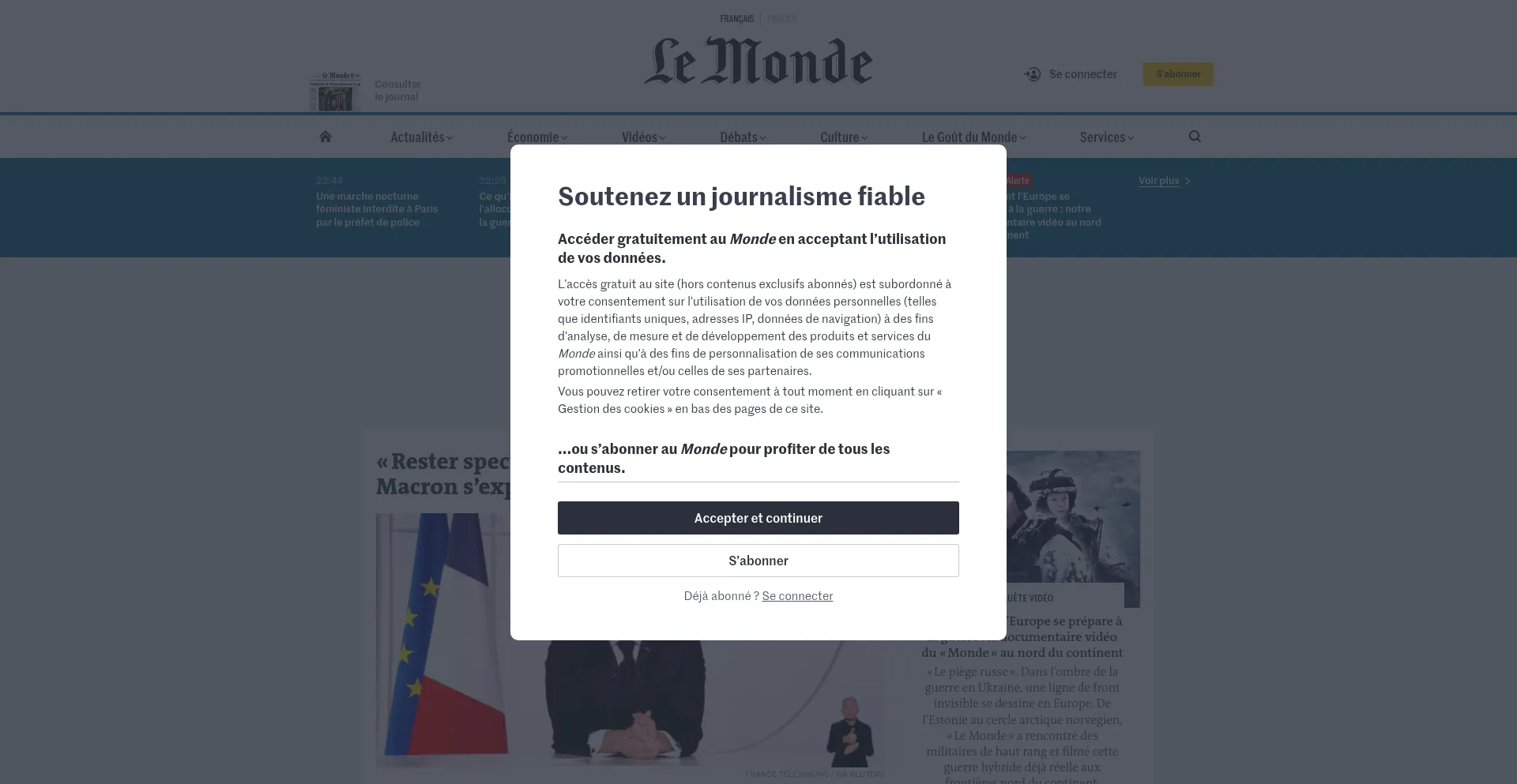 该网站实现符合GDPR或CCPA等隐私法规的cookie同意机制。这表明 lemonde.fr 遵守数据保护标准并为用户提供对个人数据收集实践的控制。