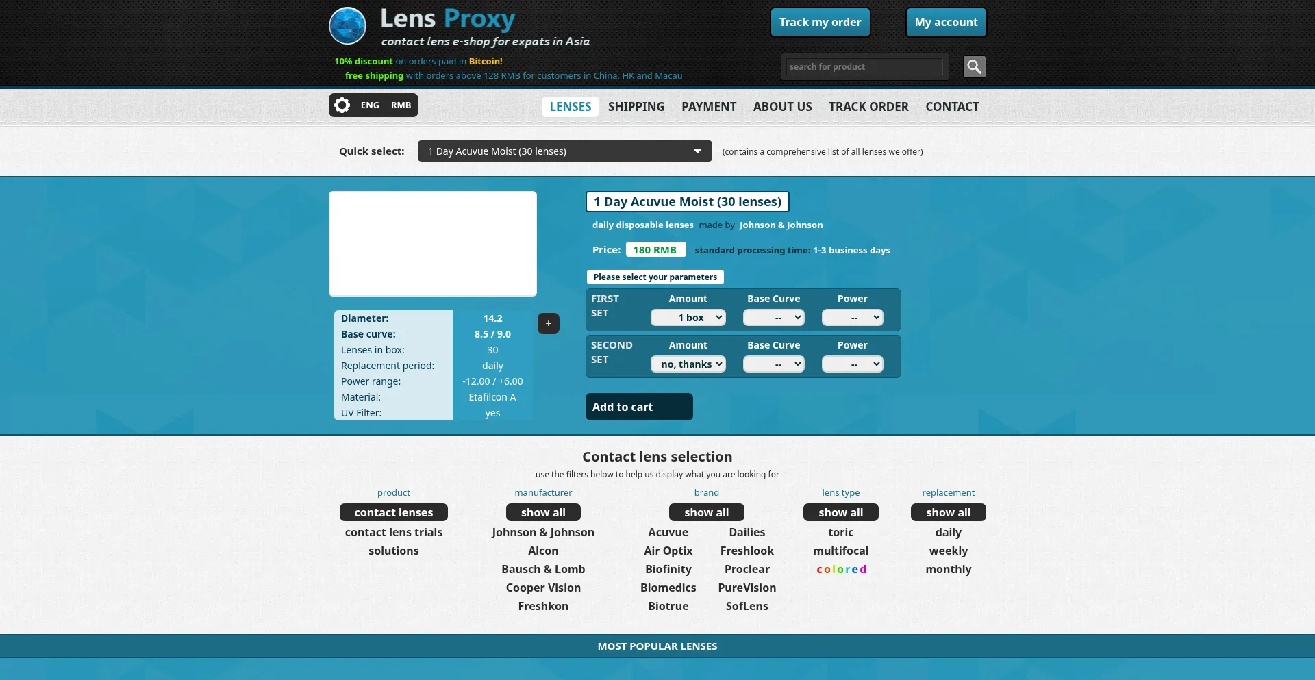 The most convenient way to buy contact lenses in China / Asia, English support and all western brands available. Worldwide shipping with Hong Kong Post / SpeedPost for custom...