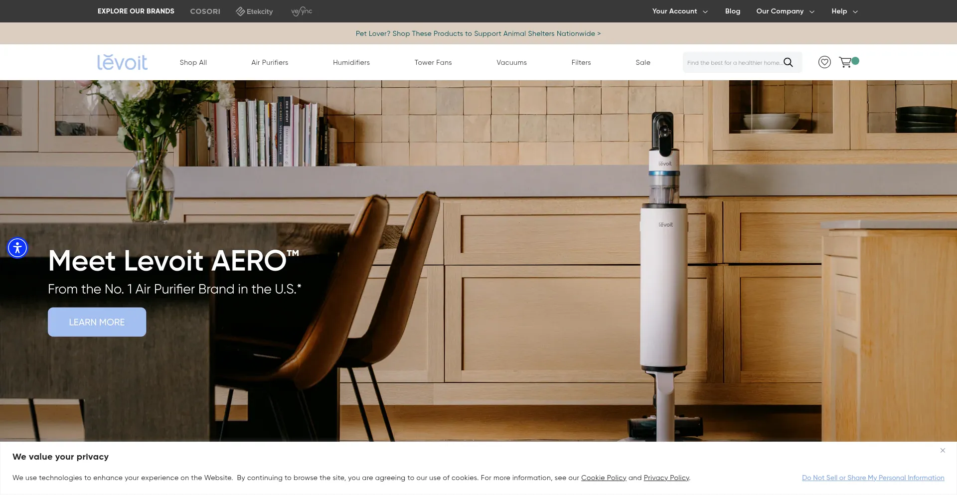 该网站实现符合GDPR或CCPA等隐私法规的cookie同意机制。这表明 levoit.com 遵守数据保护标准并为用户提供对个人数据收集实践的控制。