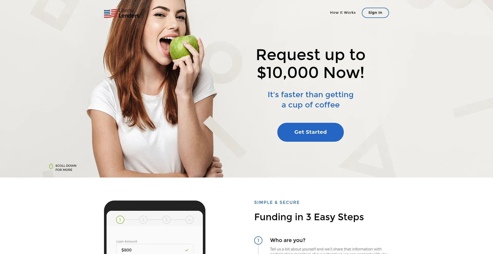 该网站实现数据收集表单,请求个人信息,包括姓名、电子邮件地址、电话号码或其他敏感详细信息。用户应验证 libertylenders.net 的合法性并在提交个人数据前查看隐私政策。