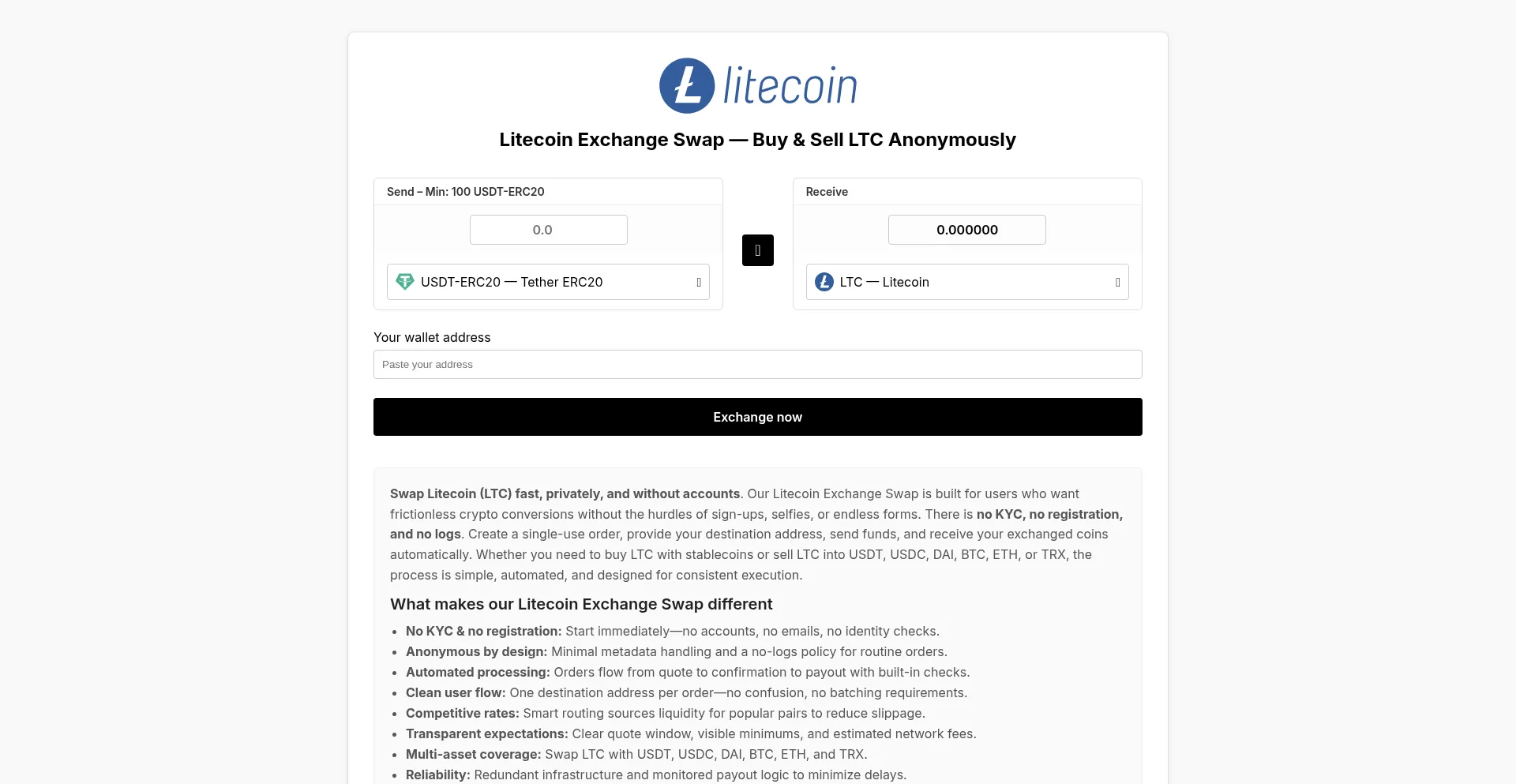 Swap Litecoin (LTC) instantly without KYC or registration. Anonymous, no logs. Buy or sell LTC for USDT, USDC, DAI, BTC, ETH, and TRX with automated processing and competitive r...