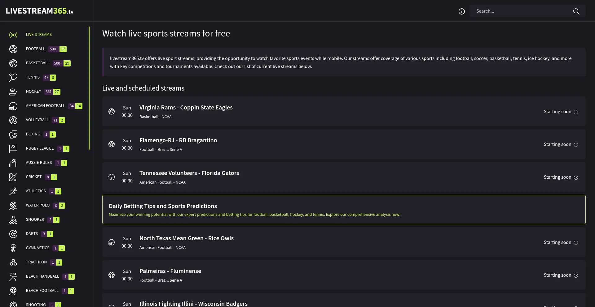 Watch sport for free - livestream365.tv The Best Sports Streaming Website to Watch Football, Basketball, Tennis and Other Sports Online & Latest Sport Videos. Live Sport Streams...