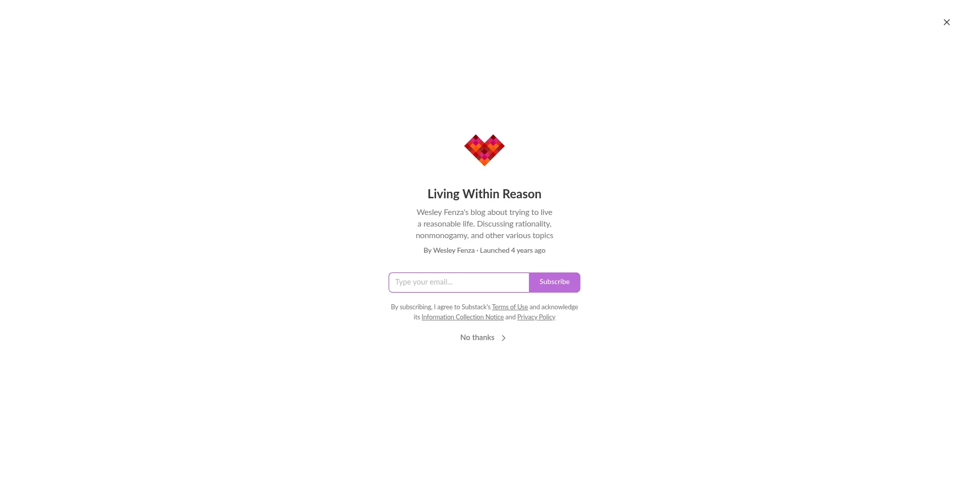 Wesley Fenza's blog about trying to live a reasonable life. Discussing rationality, nonmonogamy, and other various topics. Click to read Living Within Reason, by Wesley Fenza, a...