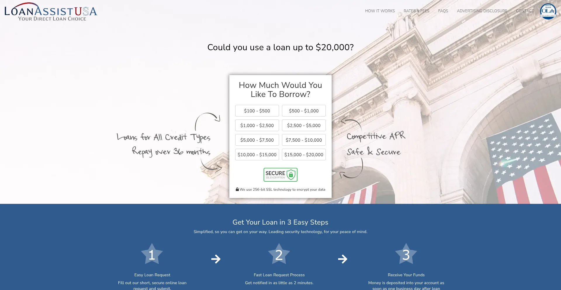 该网站实现数据收集表单,请求个人信息,包括姓名、电子邮件地址、电话号码或其他敏感详细信息。用户应验证 loanassist-usa.com 的合法性并在提交个人数据前查看隐私政策。