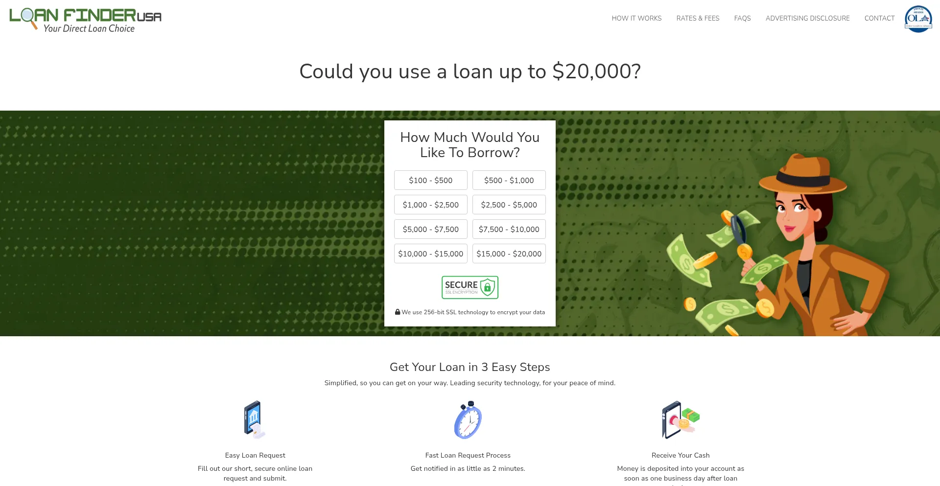 该网站实现数据收集表单,请求个人信息,包括姓名、电子邮件地址、电话号码或其他敏感详细信息。用户应验证 loanfinder-usa.com 的合法性并在提交个人数据前查看隐私政策。
