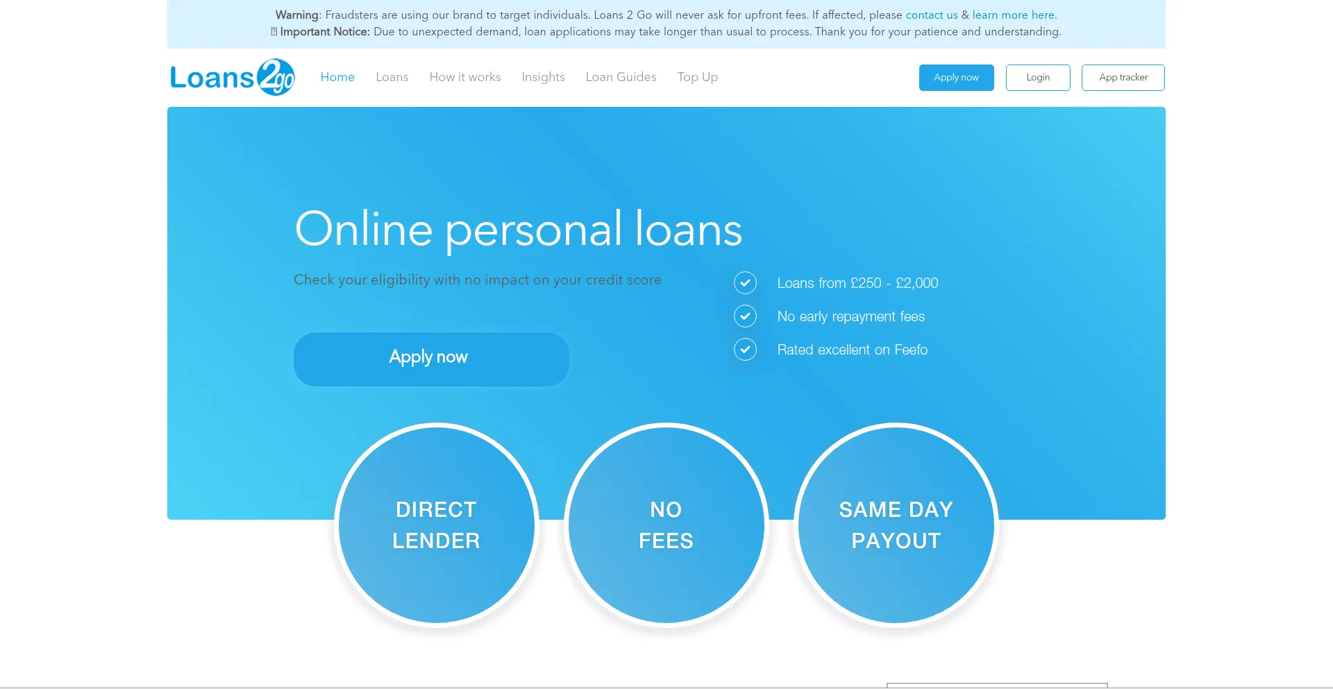 Loans 2 Go: Online decision in seconds - Money same day. We like to say YES! Poor credit history considered. Direct Lender. No Fees