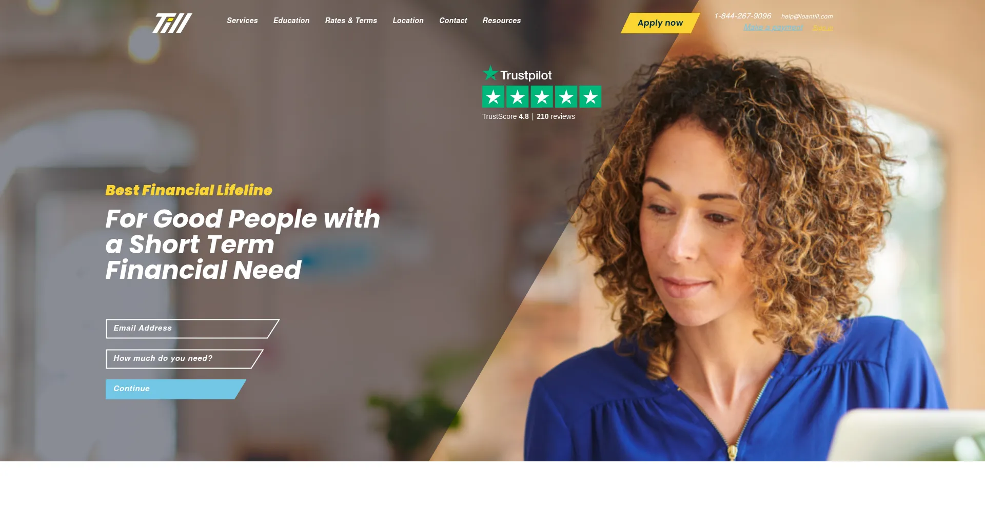 该网站实现数据收集表单,请求个人信息,包括姓名、电子邮件地址、电话号码或其他敏感详细信息。用户应验证 loantill.com 的合法性并在提交个人数据前查看隐私政策。