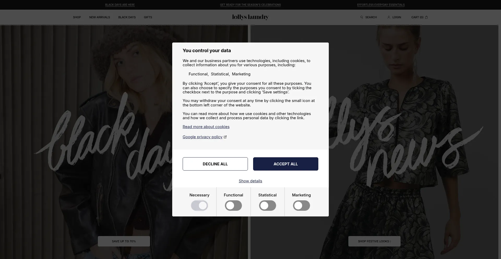 该网站实现符合GDPR或CCPA等隐私法规的cookie同意机制。这表明 lollyslaundry.com 遵守数据保护标准并为用户提供对个人数据收集实践的控制。