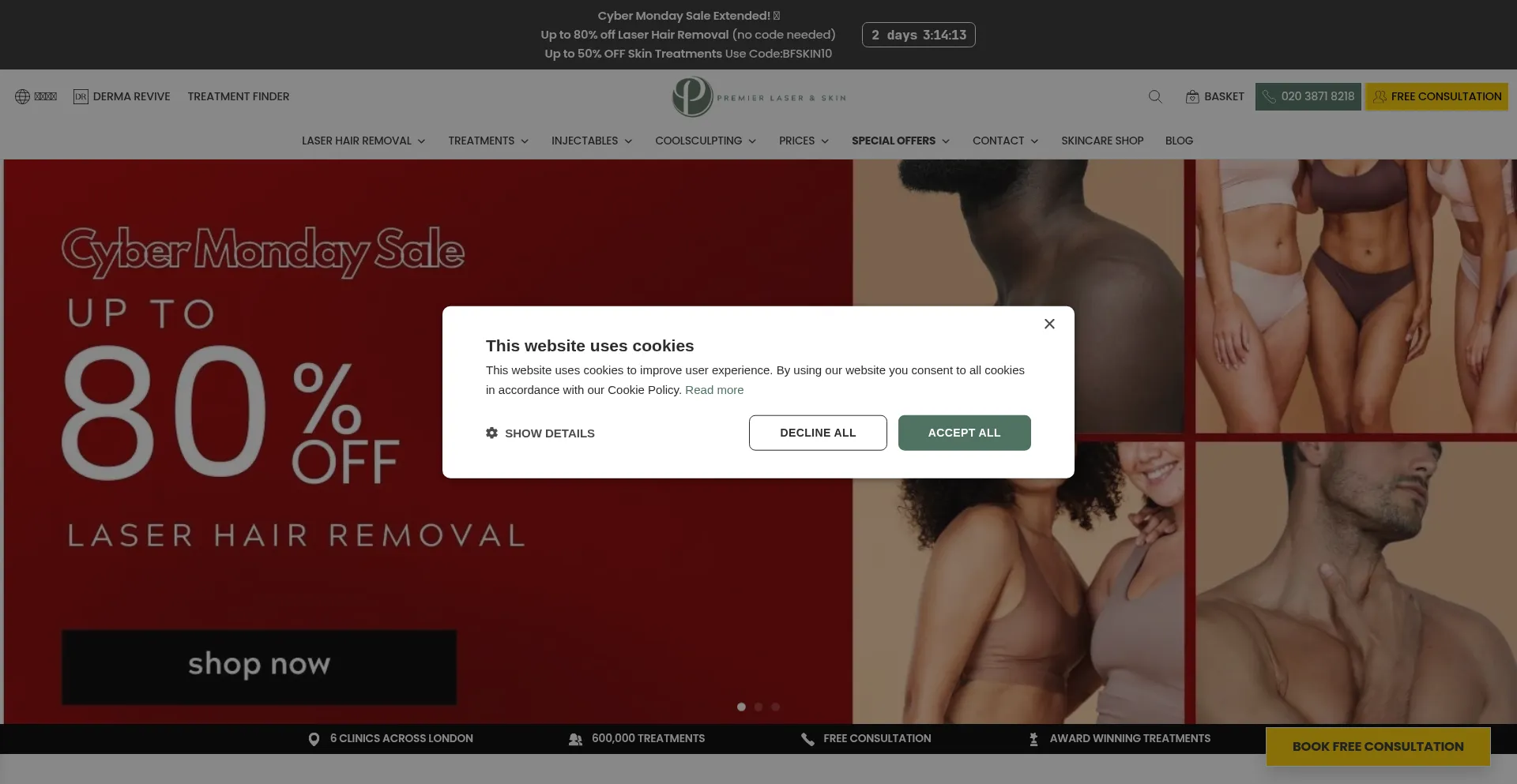 该网站实现符合GDPR或CCPA等隐私法规的cookie同意机制。这表明 londonpremierlaser.co.uk 遵守数据保护标准并为用户提供对个人数据收集实践的控制。