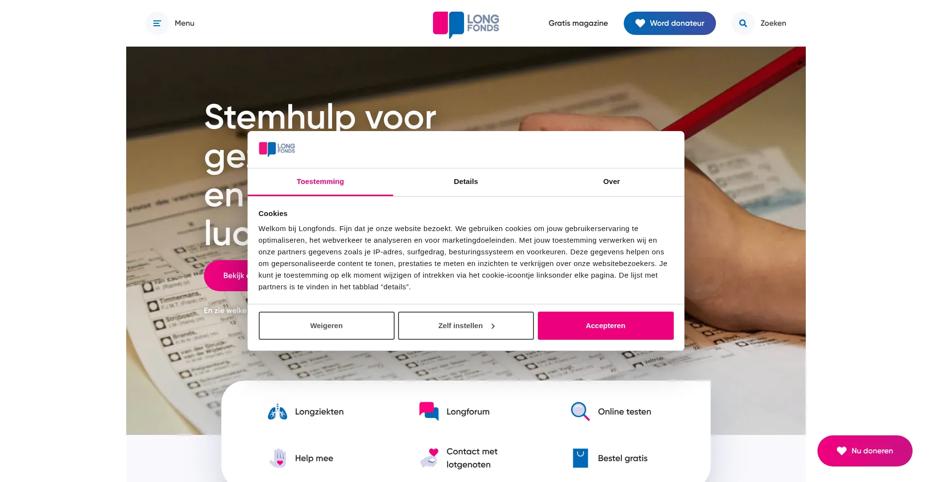 该网站实现数据收集表单,请求个人信息,包括姓名、电子邮件地址、电话号码或其他敏感详细信息。用户应验证 longfonds.nl 的合法性并在提交个人数据前查看隐私政策。