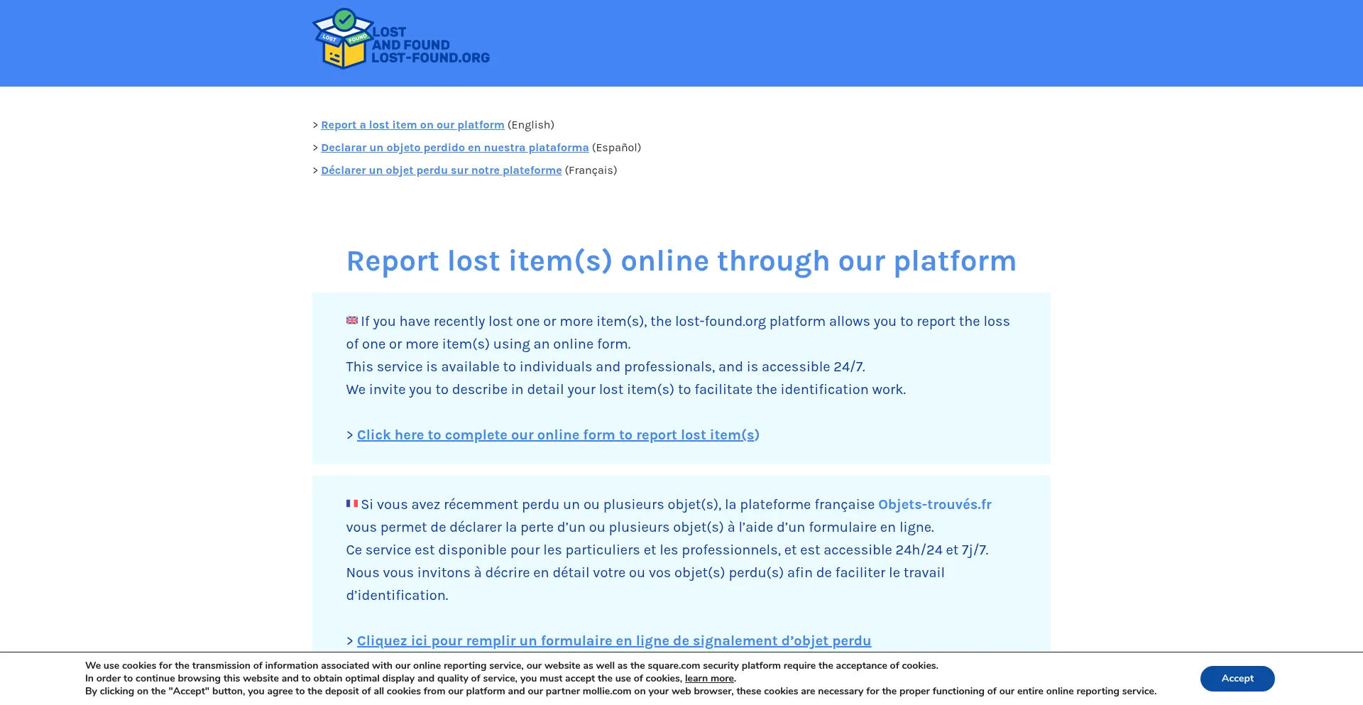 Lost and found reporting platform : report the loss of one or more item(s) online, service available 24/7 with Lost-found.org