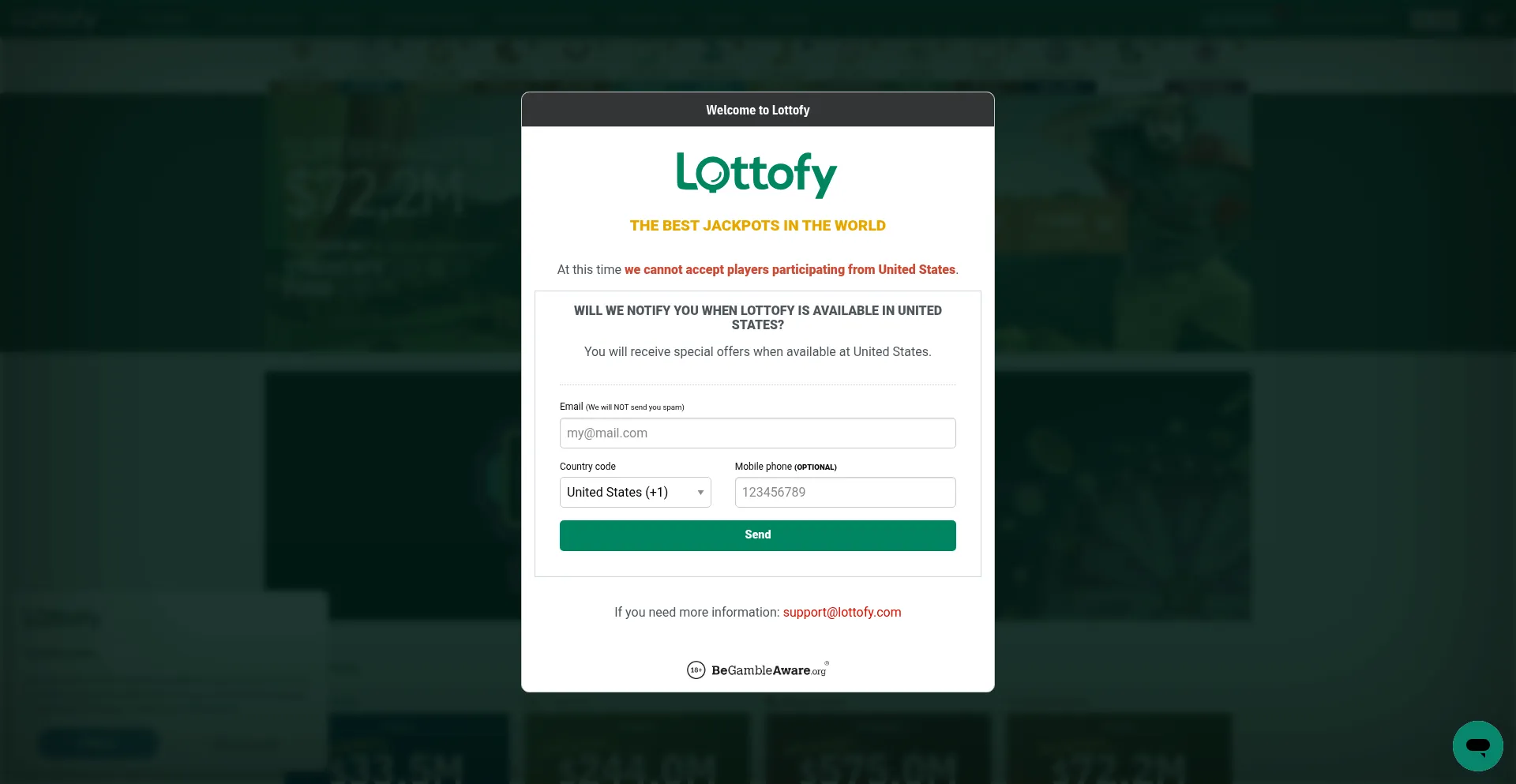 该网站实现数据收集表单,请求个人信息,包括姓名、电子邮件地址、电话号码或其他敏感详细信息。用户应验证 lottofy.com 的合法性并在提交个人数据前查看隐私政策。