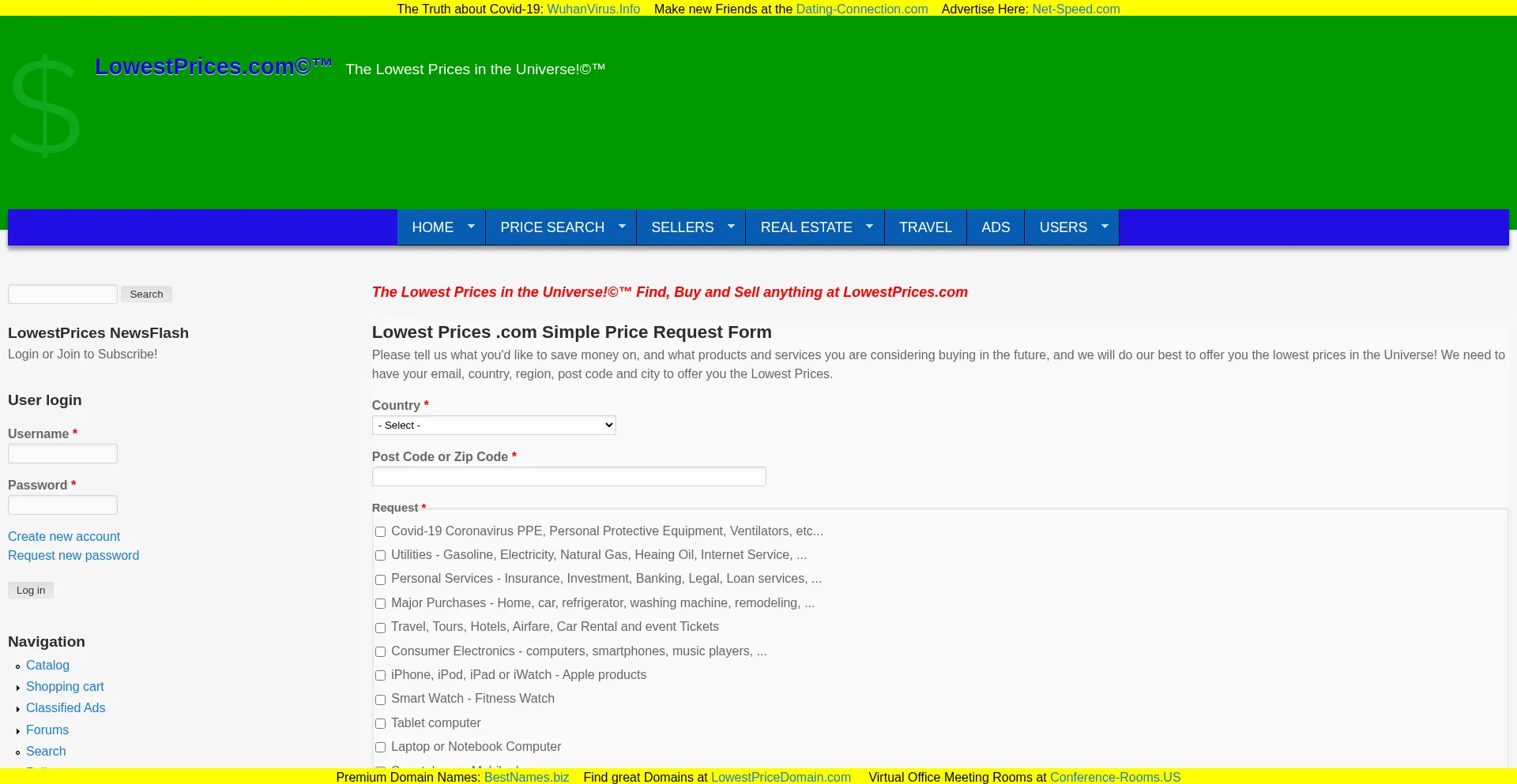 该网站实现数据收集表单,请求个人信息,包括姓名、电子邮件地址、电话号码或其他敏感详细信息。用户应验证 lowestprices.com 的合法性并在提交个人数据前查看隐私政策。
