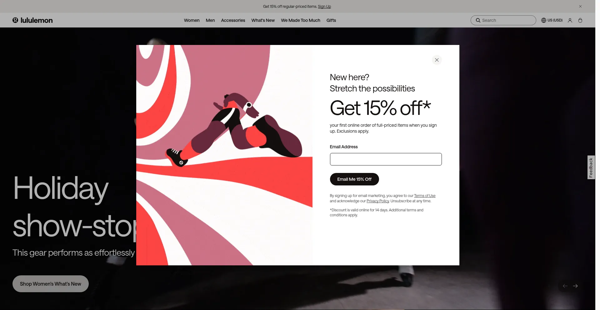 该网站实现数据收集表单,请求个人信息,包括姓名、电子邮件地址、电话号码或其他敏感详细信息。用户应验证 lululemon.com 的合法性并在提交个人数据前查看隐私政策。