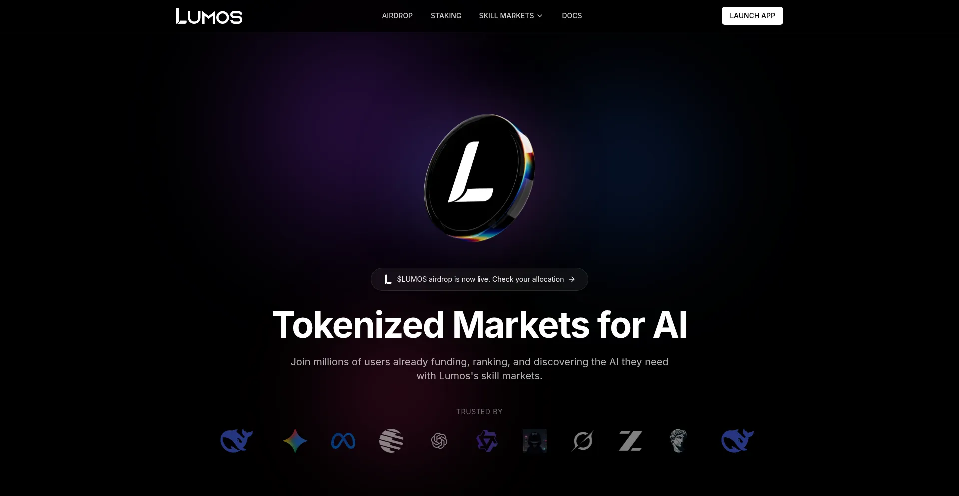 Lumos - Tokenized skill markets for AI. Fund, rank, and discover the best models and agents.