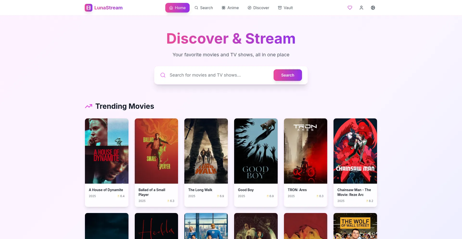 Discover and stream your favorite movies and TV shows Using LunaStream's Stunning, Simple to use platform.