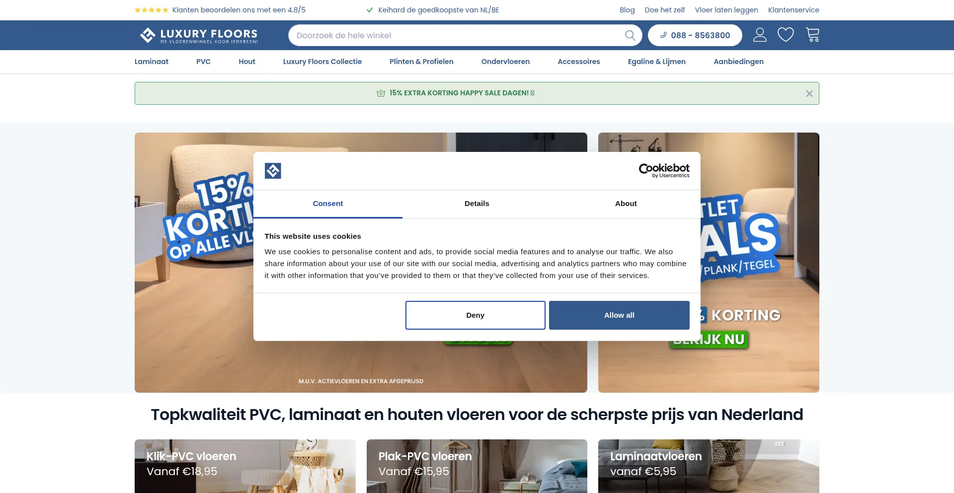 该网站实现符合GDPR或CCPA等隐私法规的cookie同意机制。这表明 luxuryfloors.nl 遵守数据保护标准并为用户提供对个人数据收集实践的控制。