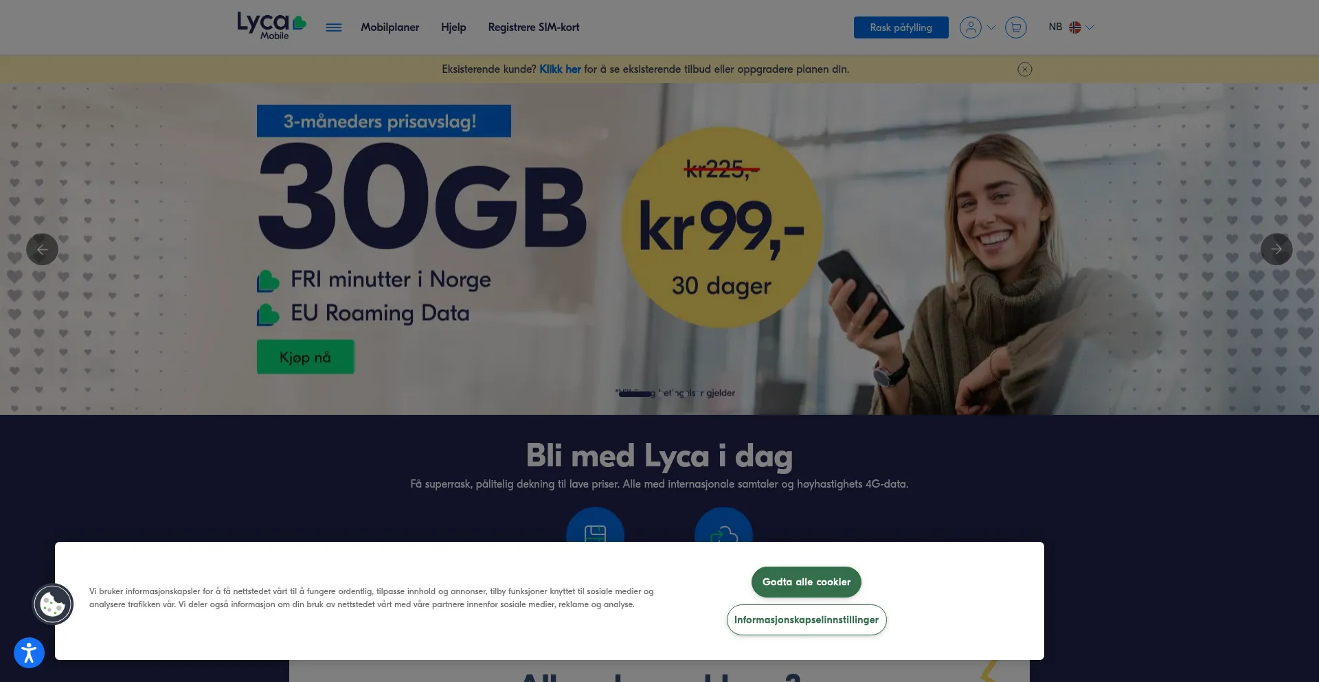 该网站实现符合GDPR或CCPA等隐私法规的cookie同意机制。这表明 lyca-mobile.no 遵守数据保护标准并为用户提供对个人数据收集实践的控制。