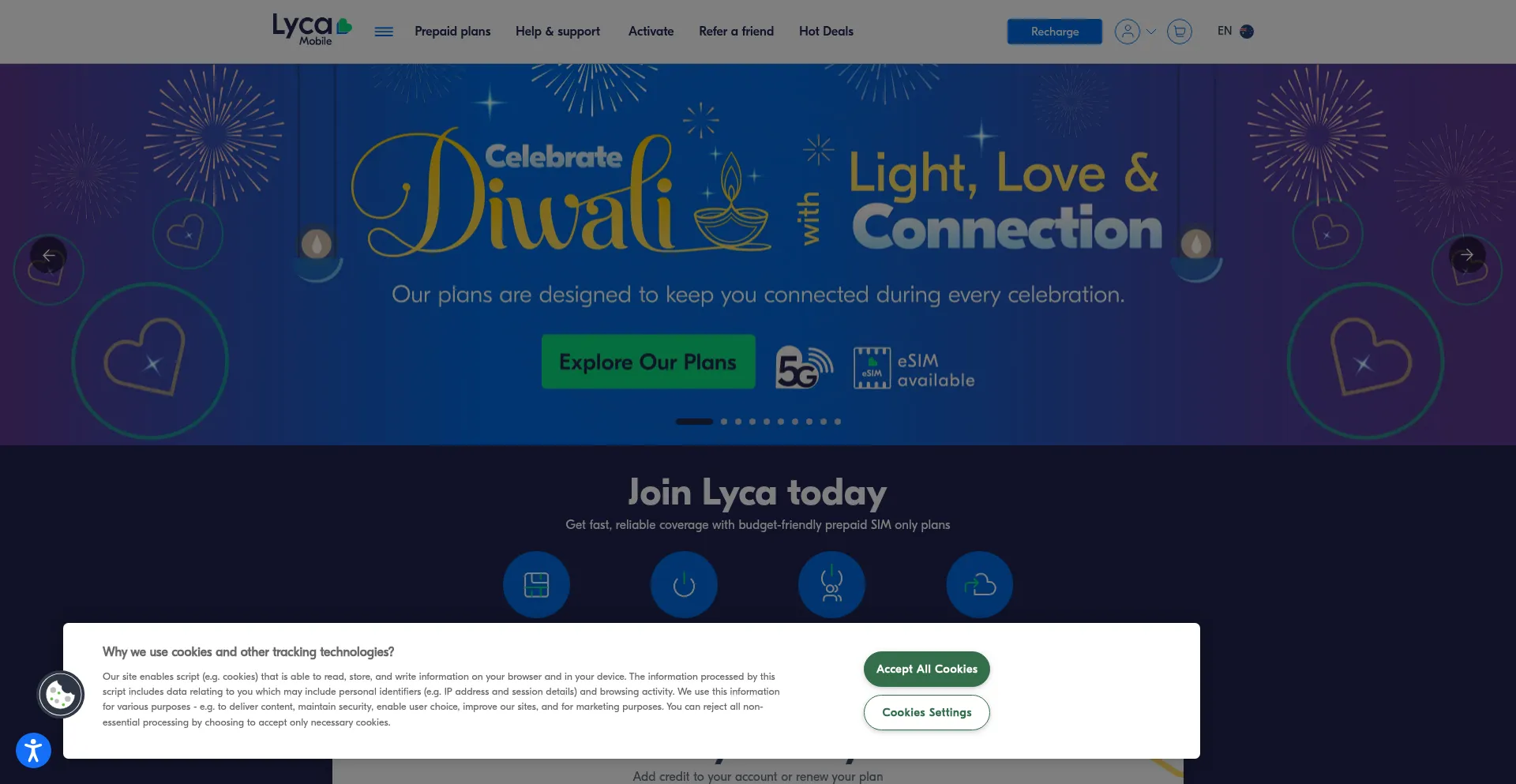 该网站实现符合GDPR或CCPA等隐私法规的cookie同意机制。这表明 lycamobile.com.au 遵守数据保护标准并为用户提供对个人数据收集实践的控制。
