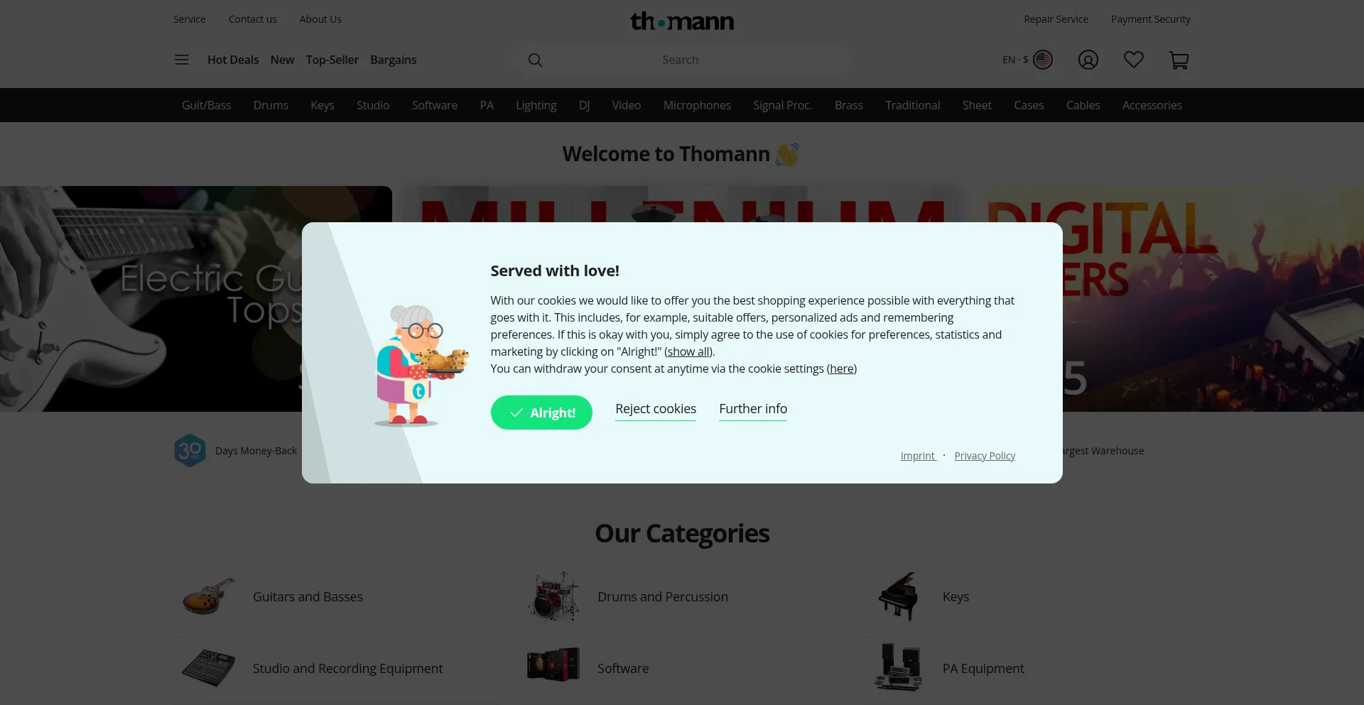 该网站实现符合GDPR或CCPA等隐私法规的cookie同意机制。这表明 m.thomann.de 遵守数据保护标准并为用户提供对个人数据收集实践的控制。