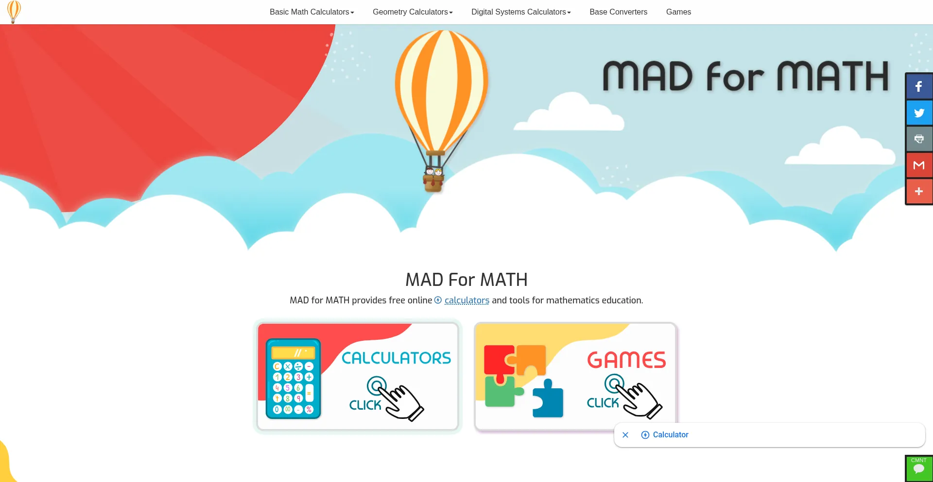 MAD for MATH provides free online mathematical tools for educational purposes. Algebra, geometry, statistics online calculation tools, fraction calculators, conversion tools, au...