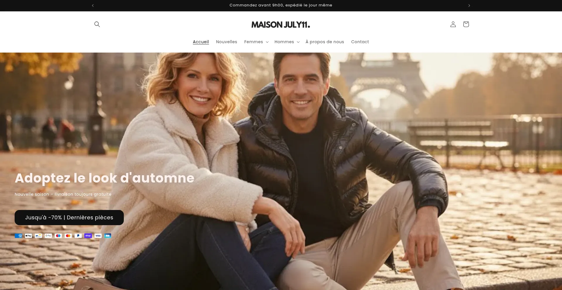 Maison July11 – Style parisien pour femmes & hommes. Mode chic et confortable, robes, ensembles & essentiels du quotidien. Livraison gratuite en France et Belgique.