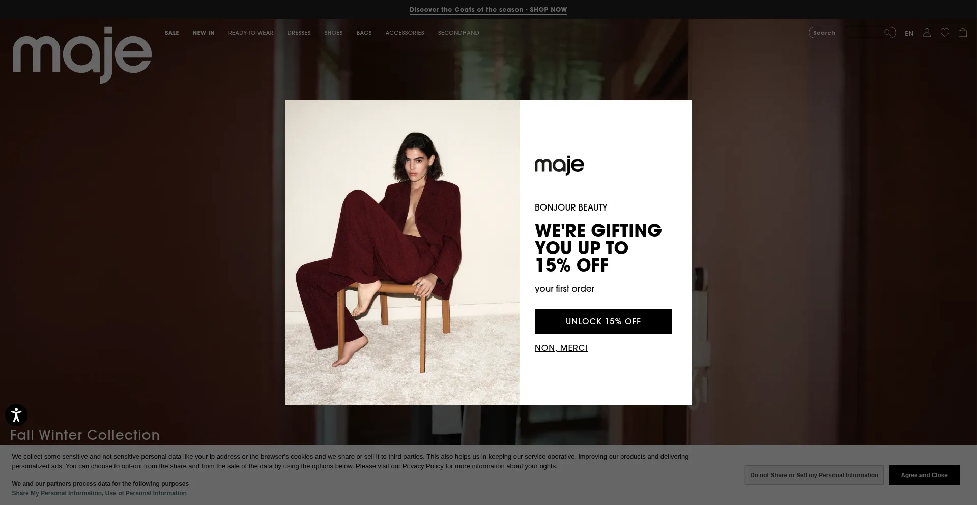 该网站实现数据收集表单,请求个人信息,包括姓名、电子邮件地址、电话号码或其他敏感详细信息。用户应验证 maje.com 的合法性并在提交个人数据前查看隐私政策。