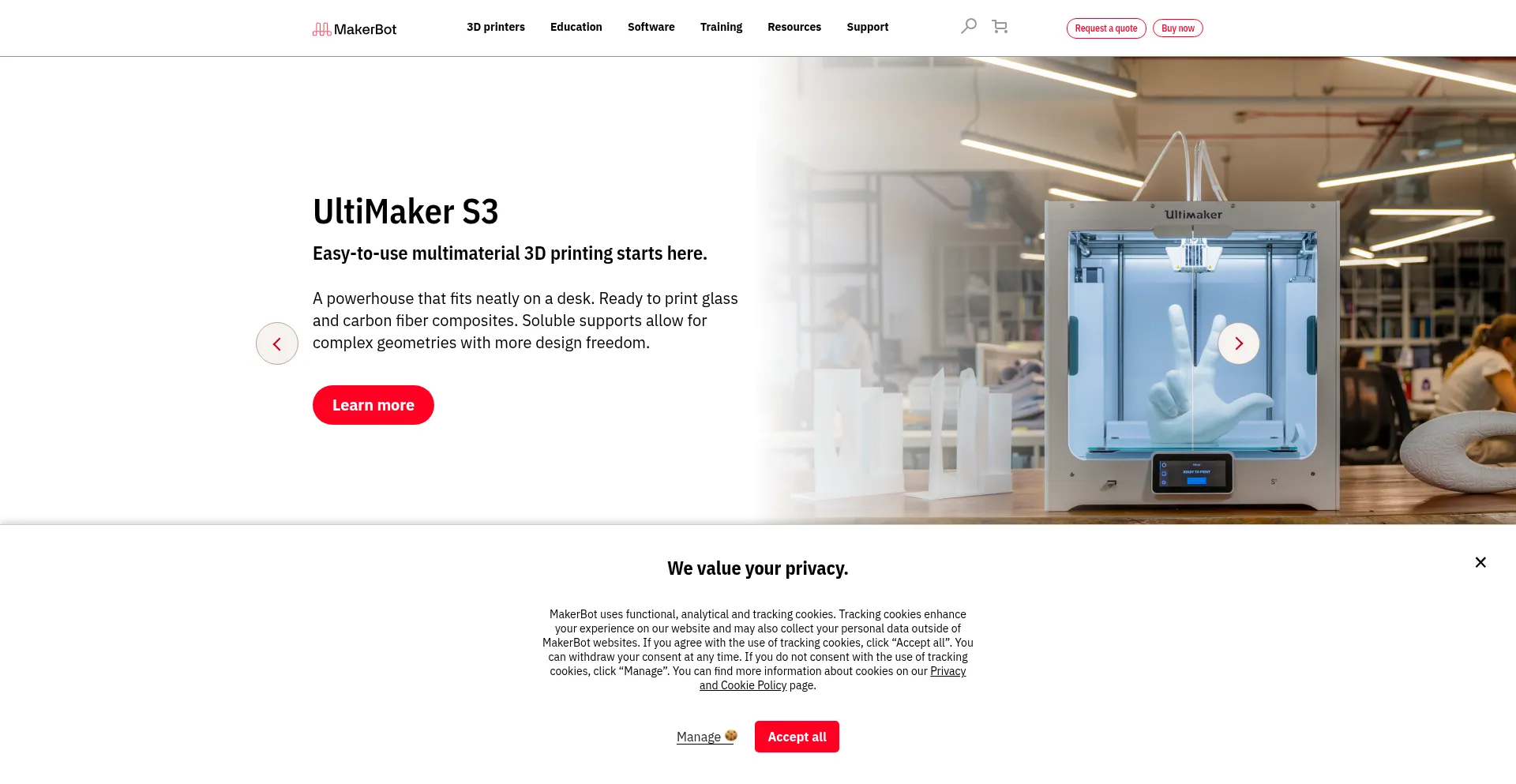 该网站实现数据收集表单,请求个人信息,包括姓名、电子邮件地址、电话号码或其他敏感详细信息。用户应验证 makerbot.com 的合法性并在提交个人数据前查看隐私政策。