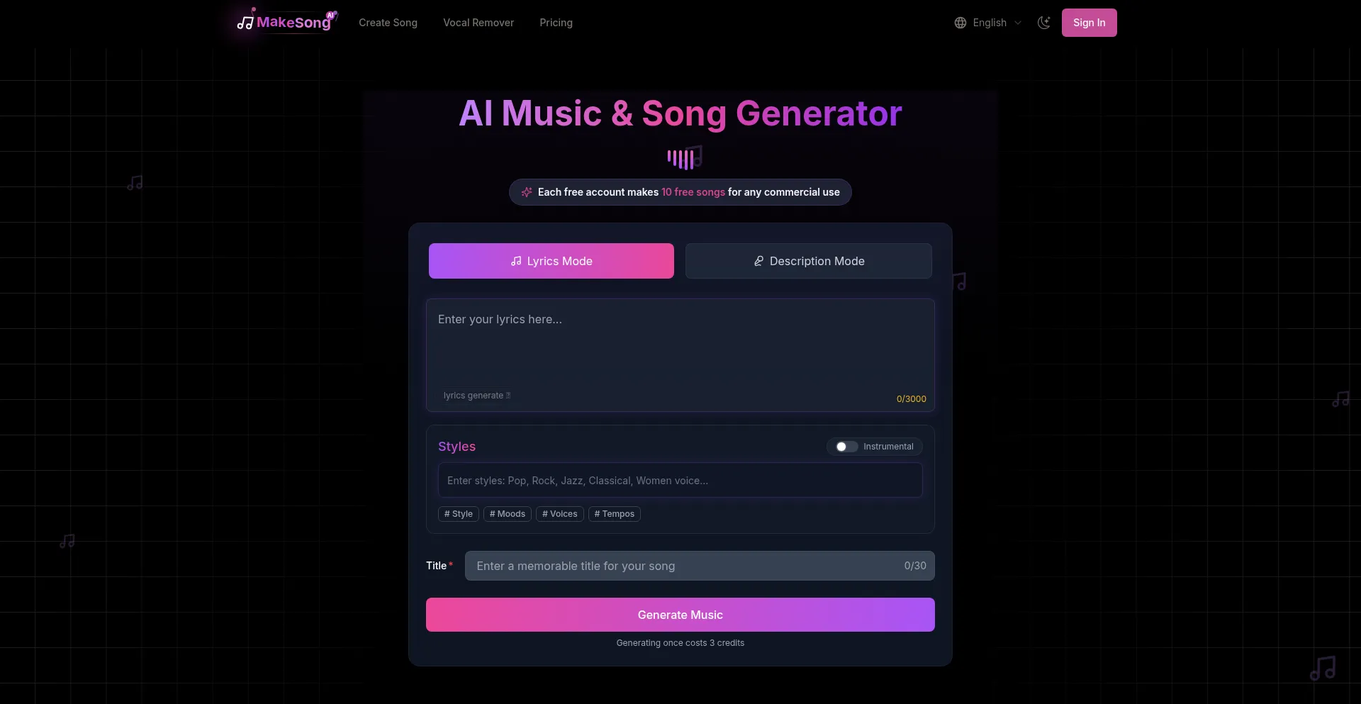 MakeSong: Your Free AI Song Generator. Create high-quality, 100% royalty-free songs.Turn text to music and lyrics to song effortlessly. MakeSong also offers powerful AI tools li...