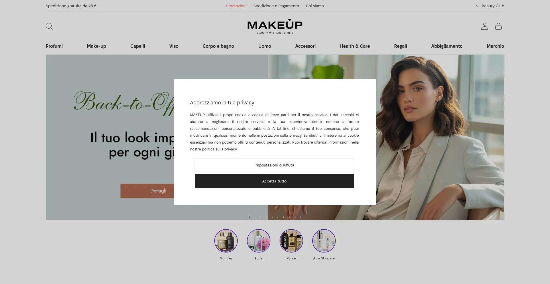 该网站实现数据收集表单,请求个人信息,包括姓名、电子邮件地址、电话号码或其他敏感详细信息。用户应验证 makeup.it 的合法性并在提交个人数据前查看隐私政策。