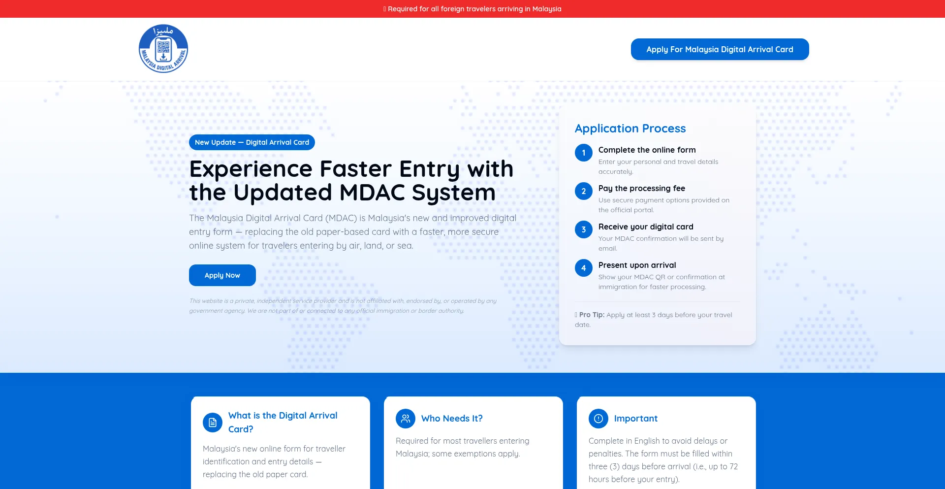 Apply for your Malaysia Digital Arrival Card (MDAC) online. Mandatory for all travelers entering Malaysia. Fast processing, 24/7 support, instant PDF delivery.