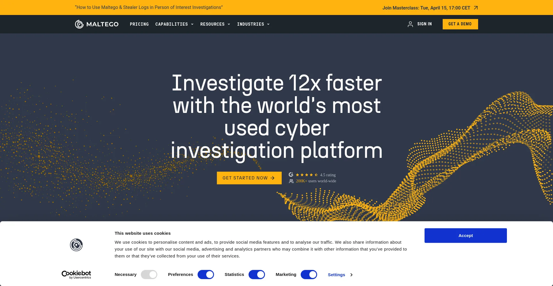 该网站实现符合GDPR或CCPA等隐私法规的cookie同意机制。这表明 maltego.com 遵守数据保护标准并为用户提供对个人数据收集实践的控制。