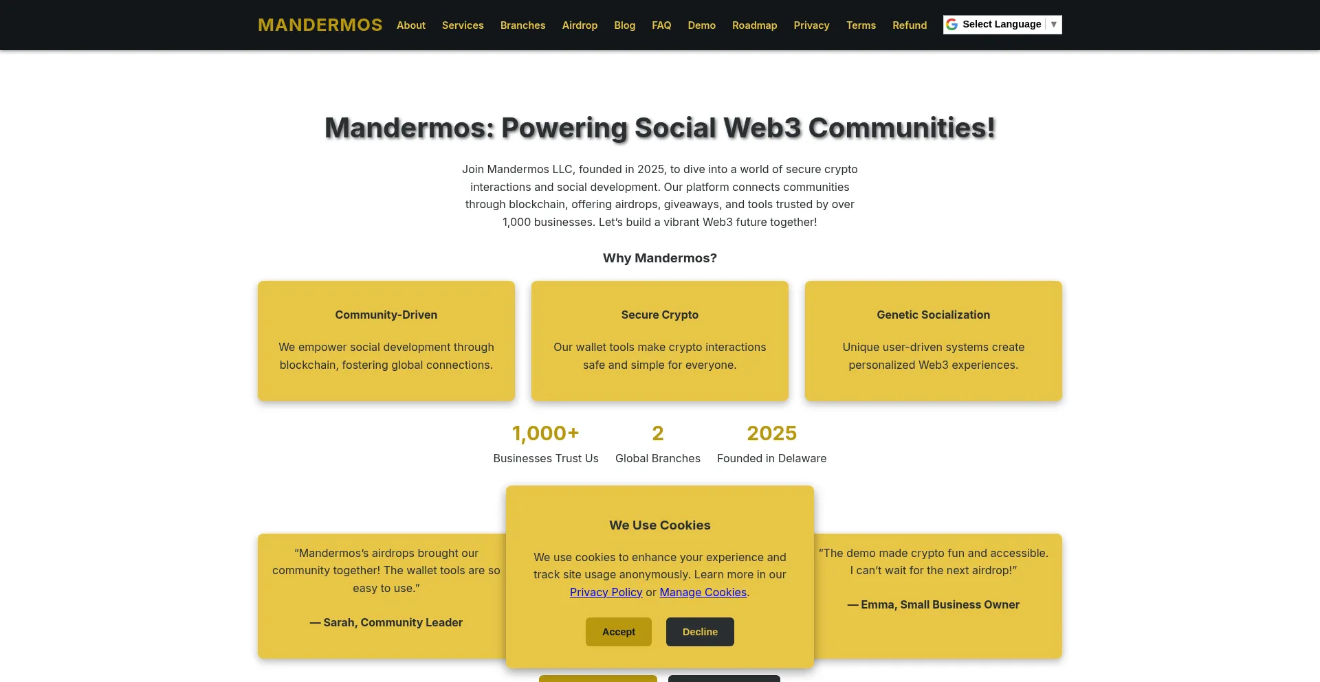 Mandermos LLC, founded in 2025, powers social development and crypto interaction through secure Web3 solutions. Join our community for airdrops and more!