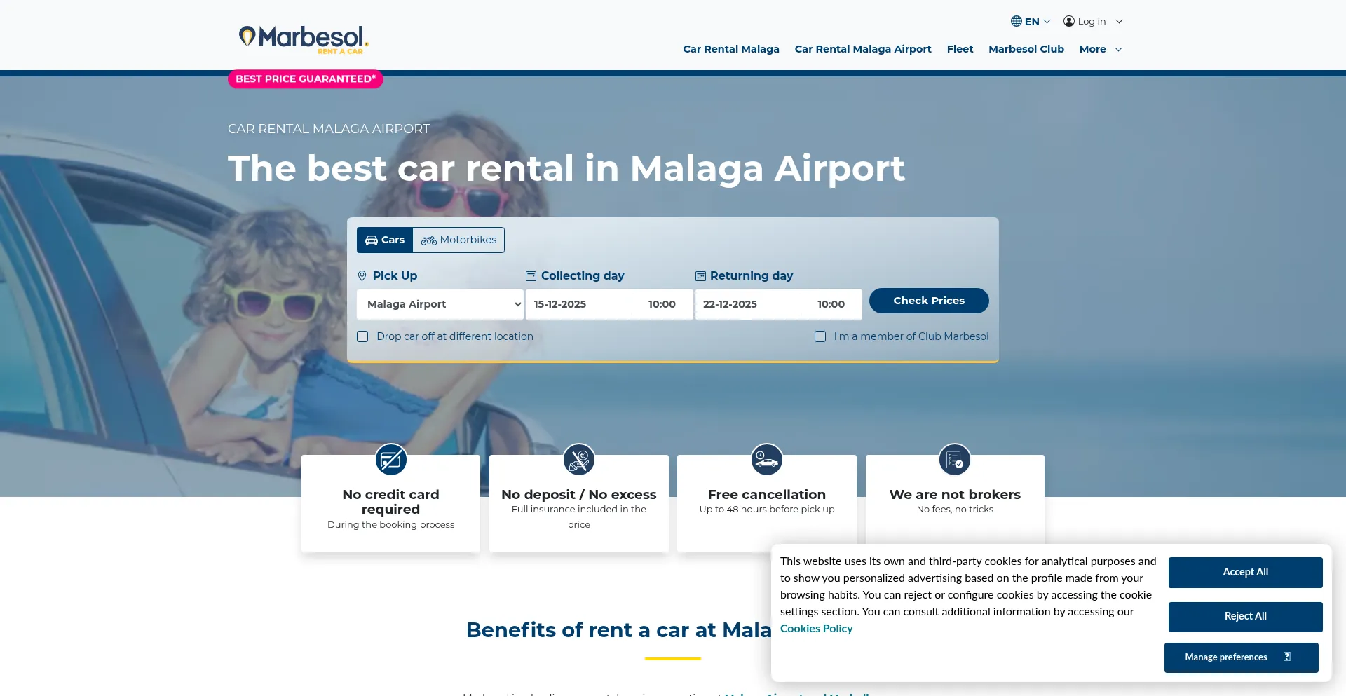 Car rental Malaga Airport and Marbella with Marbesol. Reliable service, all-inclusive rates, no deposit. Best prices guaranteed. Book your car today!