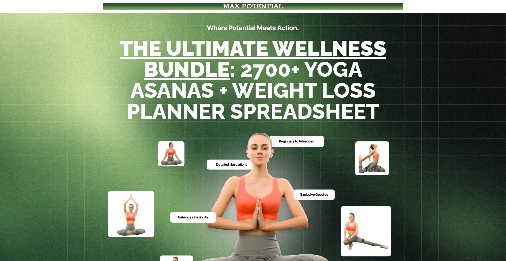 MAX POTENTIAL Where Potential Meets Action. The Ultimate Wellness Bundle: 2700+ Yoga Asanas + Weight Loss Planner Spreadsheet Transform your mind, body, and lifestyle with this ...