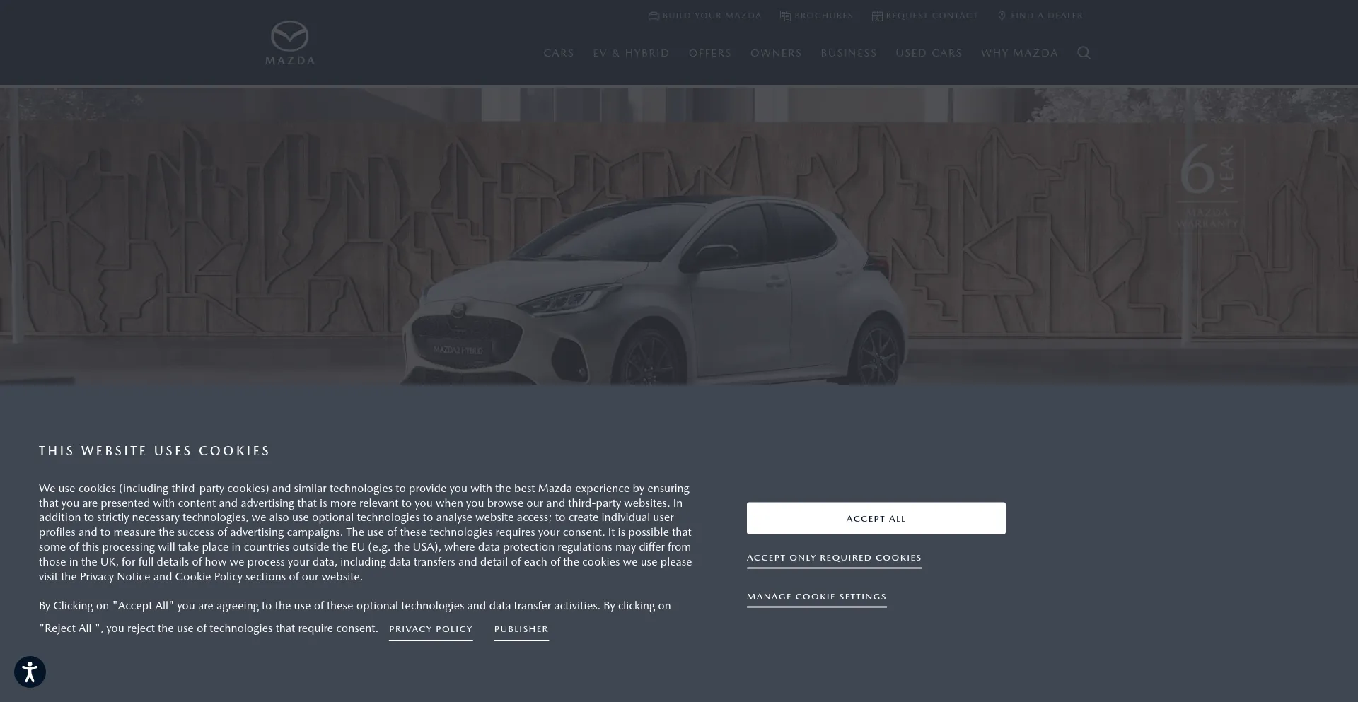 该网站实现符合GDPR或CCPA等隐私法规的cookie同意机制。这表明 mazda.co.uk 遵守数据保护标准并为用户提供对个人数据收集实践的控制。