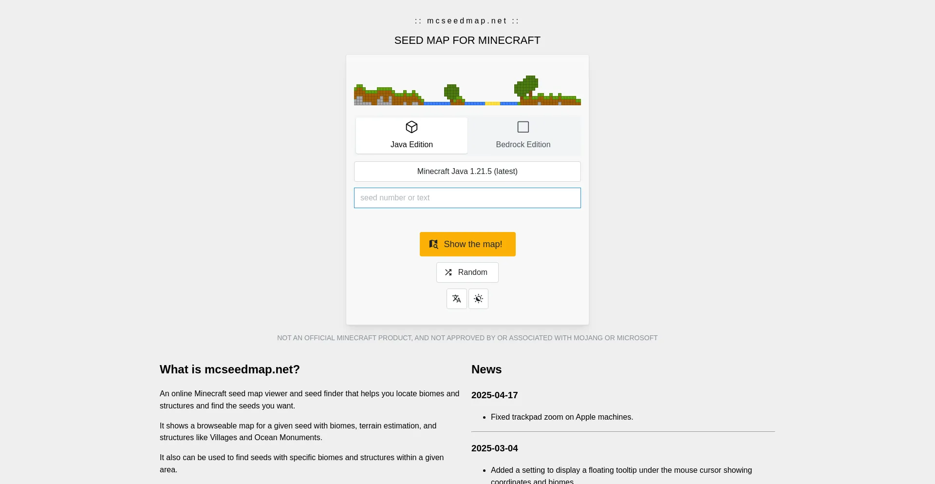 An online Minecraft seed map viewer and seed finder that helps you locate biomes and structures and find best seeds.